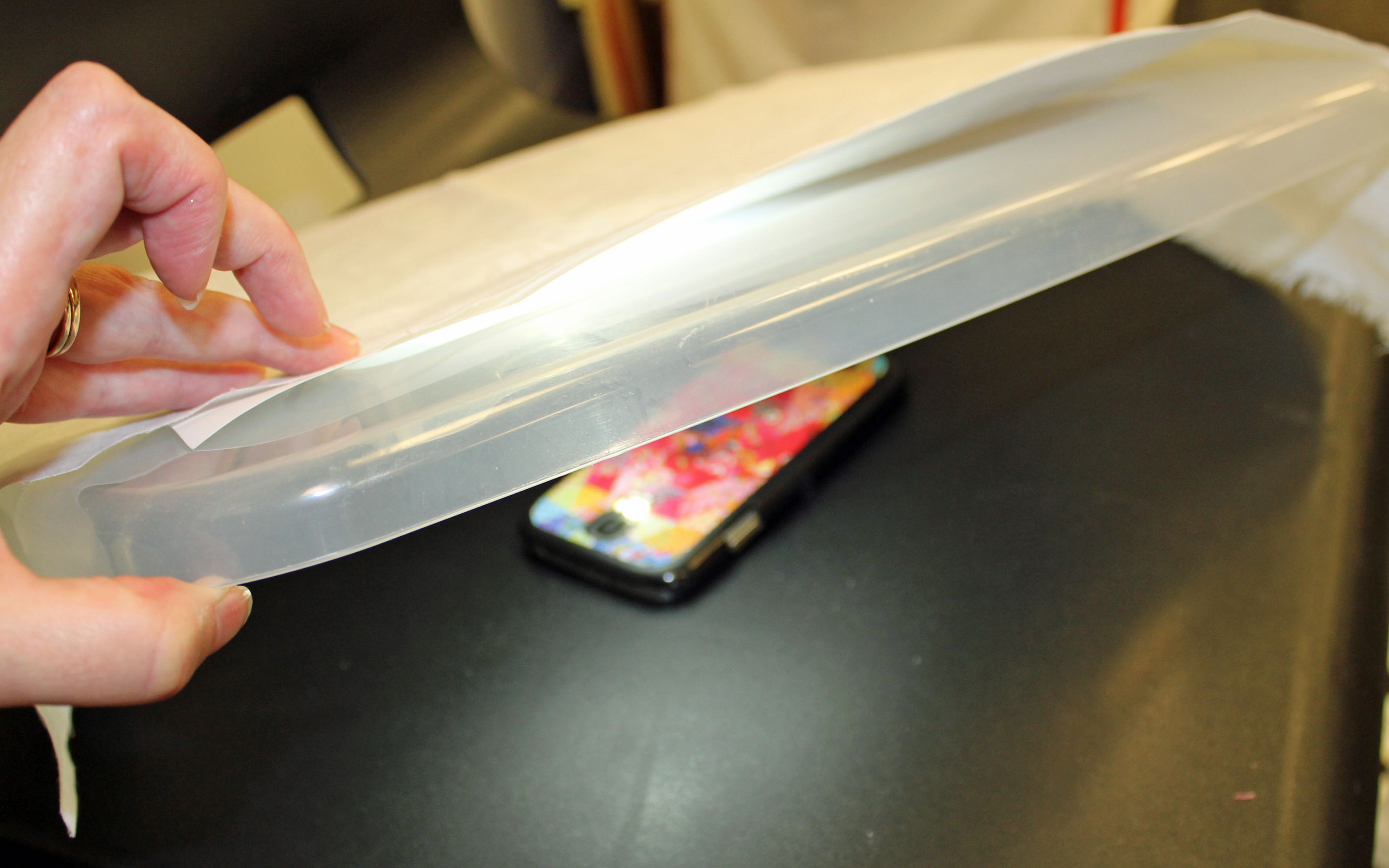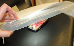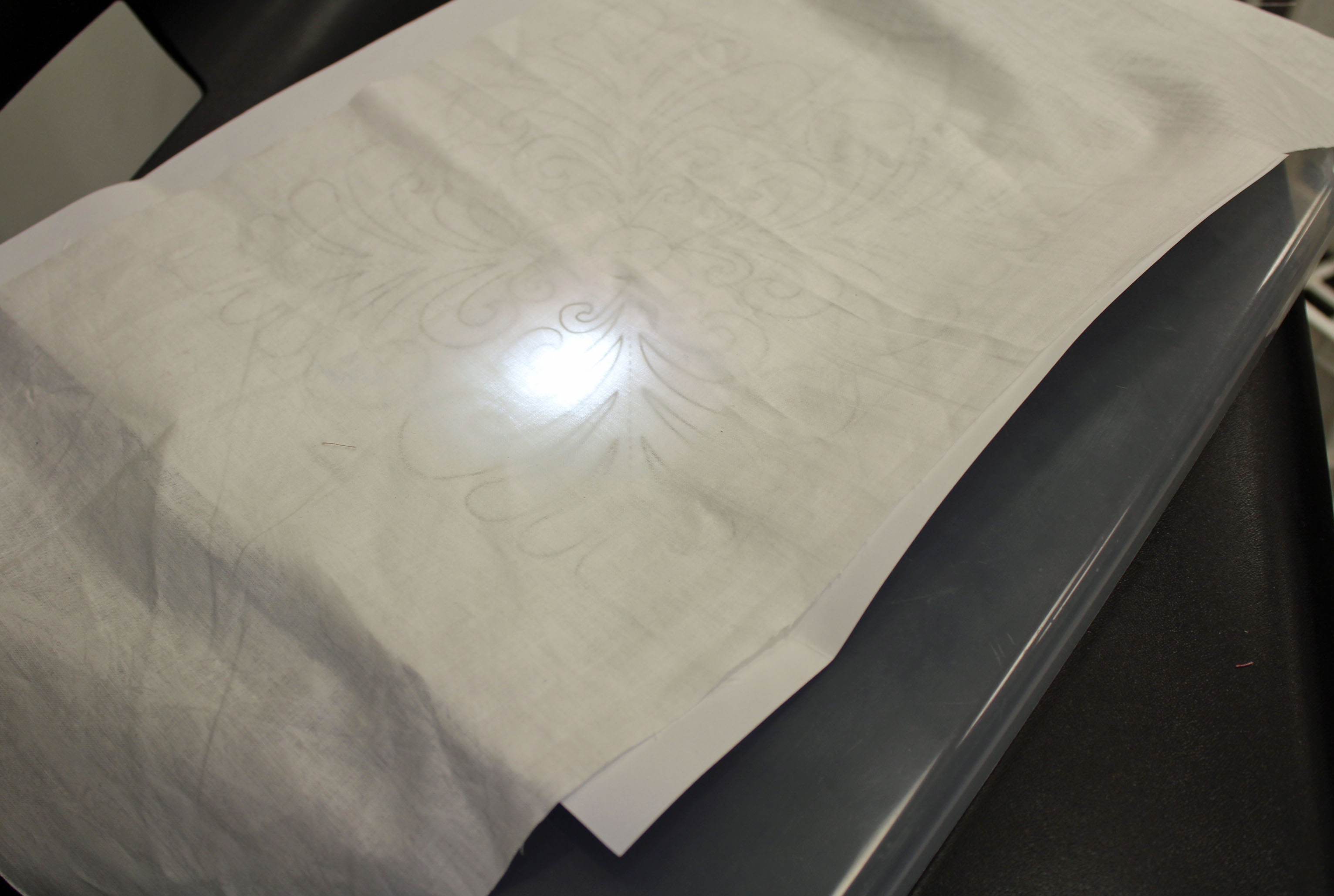 | Create your own light box to mark your quilt top while it is on the machine. Download a flashlight app on your smartphone and use this as your light source. Place the lighted phone under the qult top (on top of the batting) with a clear plastic tub lid over it. Then place the pattern to be traced on top of the lid. |
